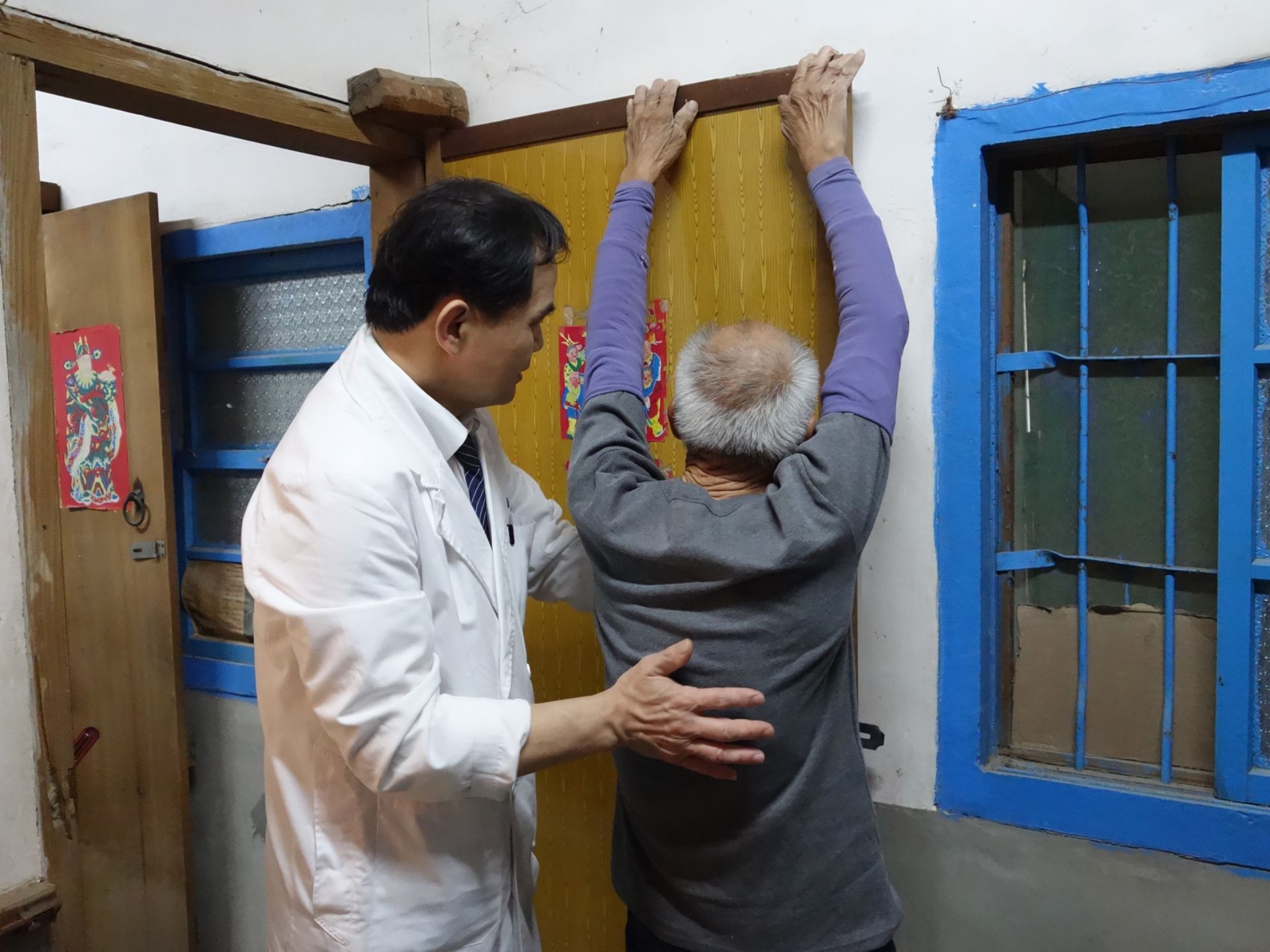 第二站前往水林鄉,關懷73歲獨居的黃先生。黃先生為風災受災戶,平日以回收維生,因頸部及胸部肌張力障礙影響姿勢。簡院長現場為他檢查並示範簡易伸展運動,提醒持續追蹤治療的重要性。即便生活艱辛,黃先生仍以笑容面對一切,知足惜福的態度讓同行人員深受感動。